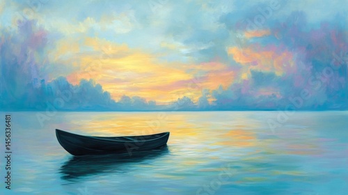 Fototapeta premium Serene Sunset Landscape with Small Boat on Calm Water