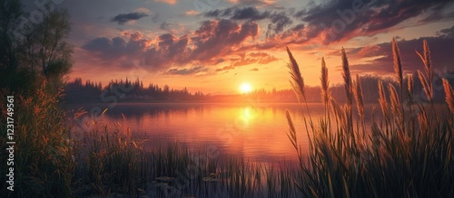 © StockKing, Obraz premium Serene sunset landscape with vibrant orange and purple sky, reflecting on calm lake waters, tall grasses silhouetted at the shoreline.