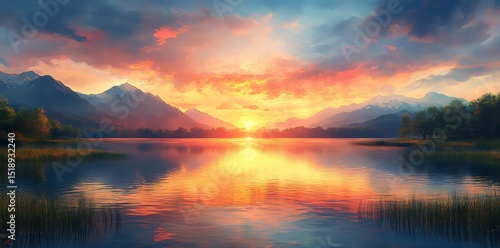© nurion, Fototapeta premium Serene Sunset: Mountain Lake Panorama in Warm Hues