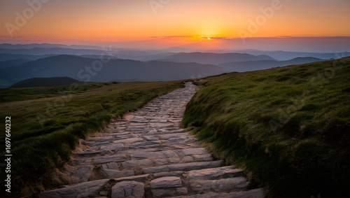 © MD ZIHAD HASAN, Fototapeta premium Serene Sunset Mountain Path Wallpaper: Stone Steps, Grassy Hills, Peaceful Landscape, Cute Nature Scene.