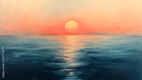 © heinng, Obraz premium Serene Sunset Ocean Painting Warm Hues Calm Waters. AI Generated