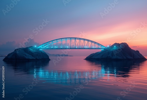 Naklejka premium Serene Sunset Over a Bridge Spanning Calm Waters Between Rocky Outcrops