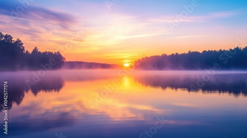 Fototapeta premium Serene sunset over a calm lake, reflecting vibrant colors and misty...