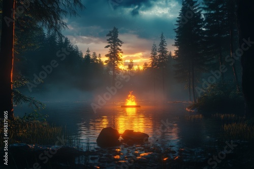 © AMINE, Fototapeta premium Serene sunset over a forest river with bonfire.