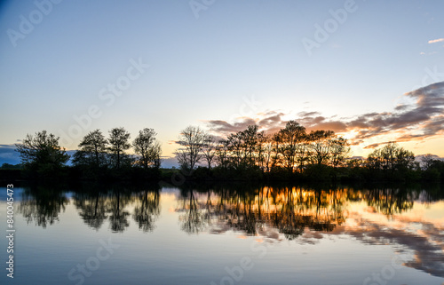 Fototapeta premium Serene sunset over a French river with calm waters reflecting clouds and...