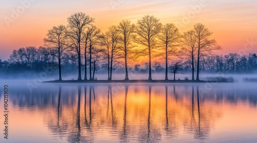 © elimicel, Obraz premium Serene sunset over a lake with silhouetted trees reflecting in calm waters.