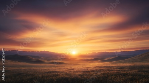 © AhmadTriwahyuutomo, Obraz premium Serene sunset over a mountainous landscape with vibrant colors and soft clouds.