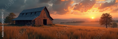 Fototapeta premium Serene sunset over a rustic barn in a golden field, perfect for nature, rural...
