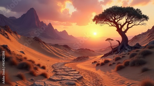 Naklejka premium Serene Sunset Over a Sandy Path Winding Through Majestic Mountains and a Lone Tree