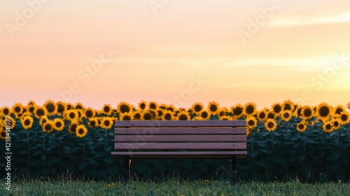 © warunthorn, Obraz premium Serene Sunset over a Sunflower Field with Wooden Bench