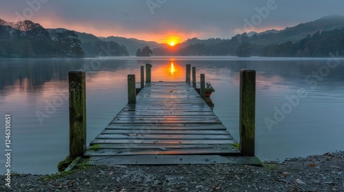 Fototapeta premium Serene sunset over a tranquil lake with a wooden dock leading into the water...
