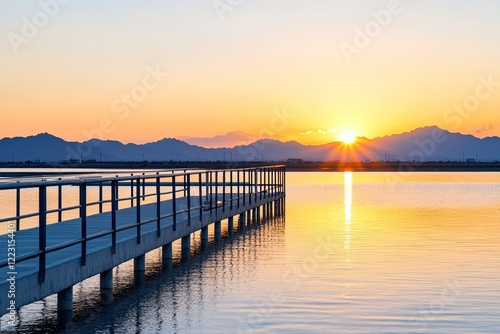 © Avelvet, Fototapeta premium Serene sunset over a tranquil lake with a wooden pier extending into the water