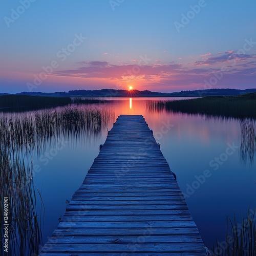 Fototapeta premium Serene sunset over a tranquil lake with a wooden pier leading into the water,...