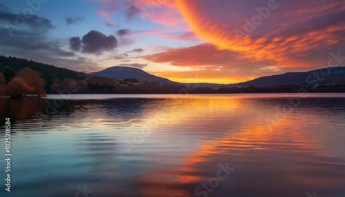 Fototapeta premium Serene sunset over a tranquil lake with vibrant skies and reflections in the...