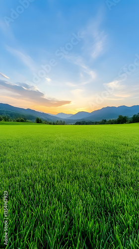 Fototapeta premium Serene sunset over a vast, vibrant green field and distant mountains