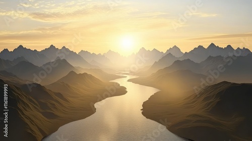 © PPS, Naklejka premium Serene sunset over a winding river in a mountainous valley.