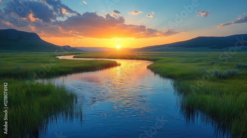 © miranti, Fototapeta premium Serene sunset over a winding river with lush green grasslands and distant mountains