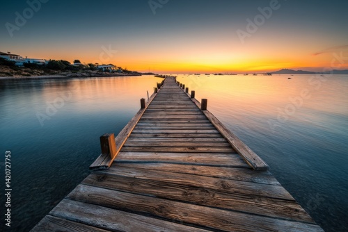 Fototapeta premium Serene sunset over a wooden pier extending into calm waters, with vibrant...