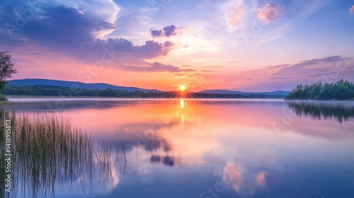 © NAZA, Fototapeta premium Serene Sunset over Calm Lake and Mountains