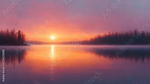Fototapeta premium serene sunset over calm lake, reflecting vibrant pastel colors