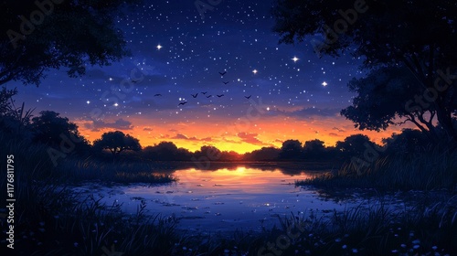 © siti, Naklejka premium Serene sunset over calm lake, stars and birds.
