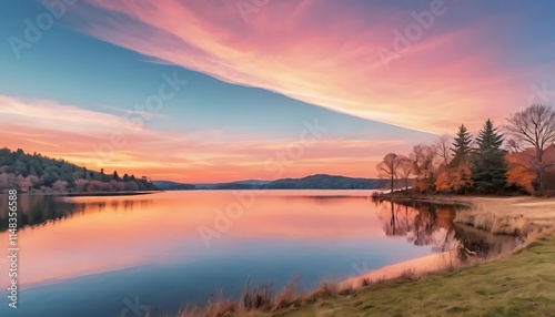 © Romeo, Fototapeta premium Serene Sunset Over Calm Lake With Autumn Trees