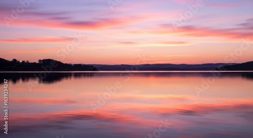 © Tika, Naklejka premium Serene Sunset Over Calm Lake with Pink and Orange Sky Reflections