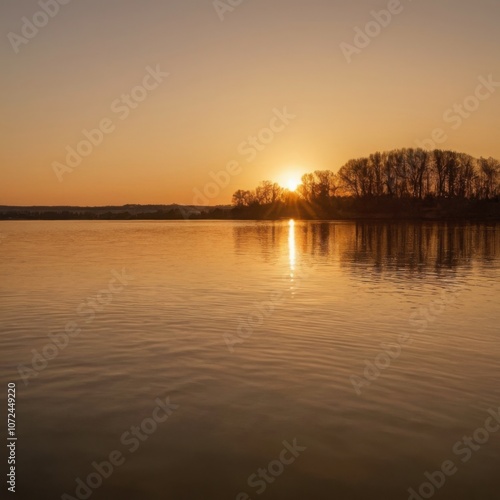 Obraz premium Serene Sunset Over Calm Lake with Silhouetted Trees and Warm Orange Sky...