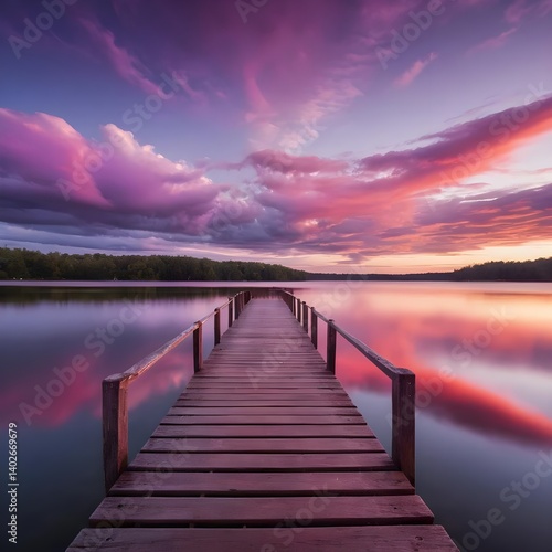 © ลลิดา ไชยศรีษะ, Obraz premium Serene Sunset over Calm Lake with Wooden Dock