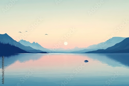 © novian, Fototapeta premium Serene Sunset Over Calm Mountain Lake Birds Fly