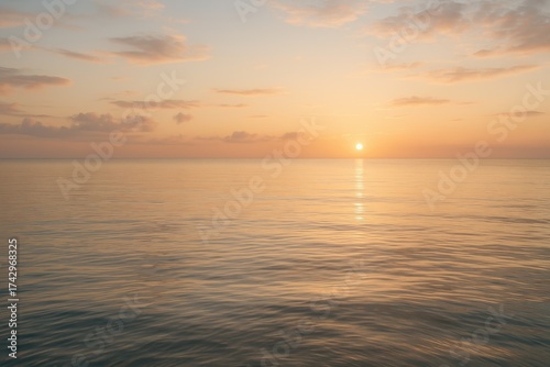 Naklejka premium Serene sunset over calm ocean gentle waves golden light soft clouds tranquil...