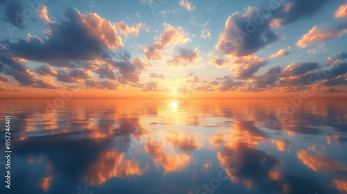 Fototapeta premium Serene sunset over calm ocean; reflection in water.