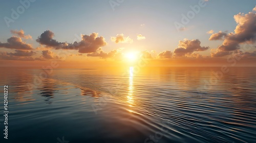 Fototapeta premium Serene Sunset Over Calm Ocean Waters with Reflection and Gentle Clouds in a Beautiful Horizon Landscape