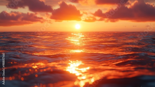 © julio, Obraz premium Serene sunset over calm ocean waters with reflective light.