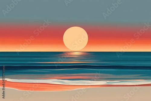 Obraz premium Serene sunset over calm ocean waves, painting-like illustration.