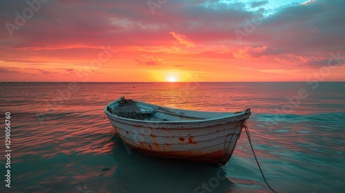 Fototapeta premium Serene sunset over calm ocean with a weathered fishing boat gently bobbing on the water. Peaceful and tranquil scene perfect for travel or relaxation themes.