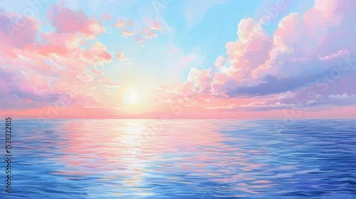 © Othello, Obraz premium Serene sunset over calm ocean with pastel clouds reflecting on the water.