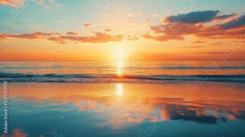 © Kitta Studio, Fototapeta premium Serene Sunset Over Calm Ocean with Reflection and Vibrant Clouds