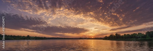 Fototapeta premium Serene Sunset Over Calm River with Vibrant Cloudscape and Green Trees in...
