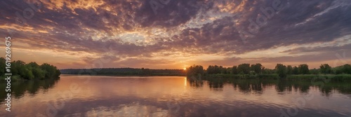 © anis, Obraz premium Serene Sunset Over Calm River with Vibrant Cloudy Sky and Lush Green Trees