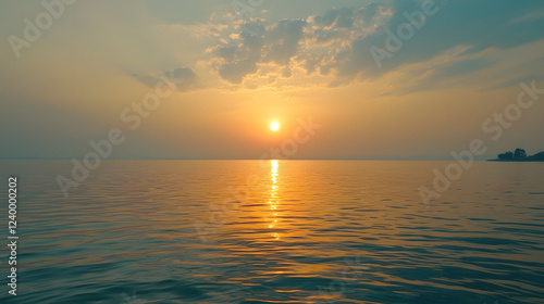 Naklejka premium Serene Sunset Over Calm Sea: A breathtaking sunset paints the sky with vibrant hues of orange and gold, its reflection shimmering on the tranquil surface of the ocean.
