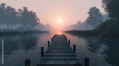 Fototapeta premium Serene Sunset Over Calm Water with Wooden Dock and Misty Trees