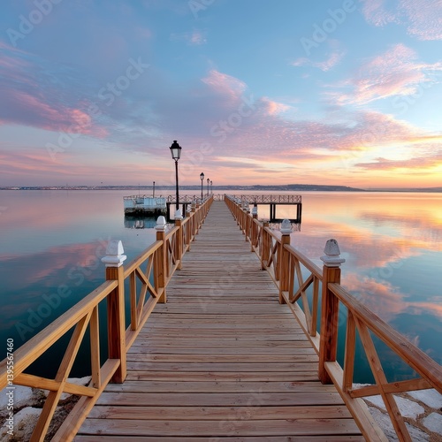Obraz premium Serene Sunset Over Calm Waters from a Wooden Pier with Lanterns