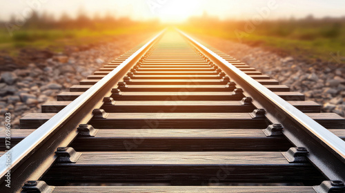 © Gun, Fototapeta premium Serene Sunset Over Empty Railroad Tracks Leading into Distant Horizon with Warm Sunlight and Soft Landscape in Background