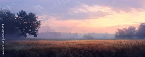© Reyhan, Fototapeta premium Serene Sunset Over Golden Grassland And Trees