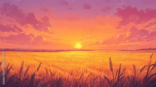 Obraz premium Serene Sunset Over Golden Wheat Field with Colorful Sky and Gentle Clouds
