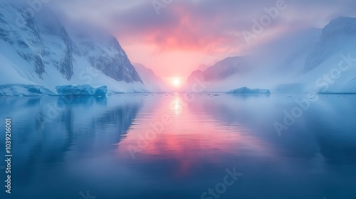 Fototapeta premium Serene sunset over icy fjord with reflections and mist.