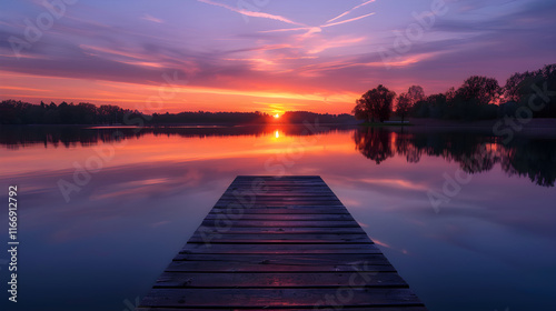 Naklejka premium Serene Sunset Over Lake with Reflective Water and Wooden Pier, Silhouetted...