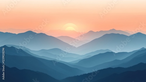 © badrun, Fototapeta premium Serene sunset over layered blue mountains.