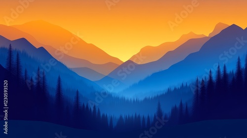 Fototapeta premium Serene sunset over layered mountains with silhouettes of pine trees in the...